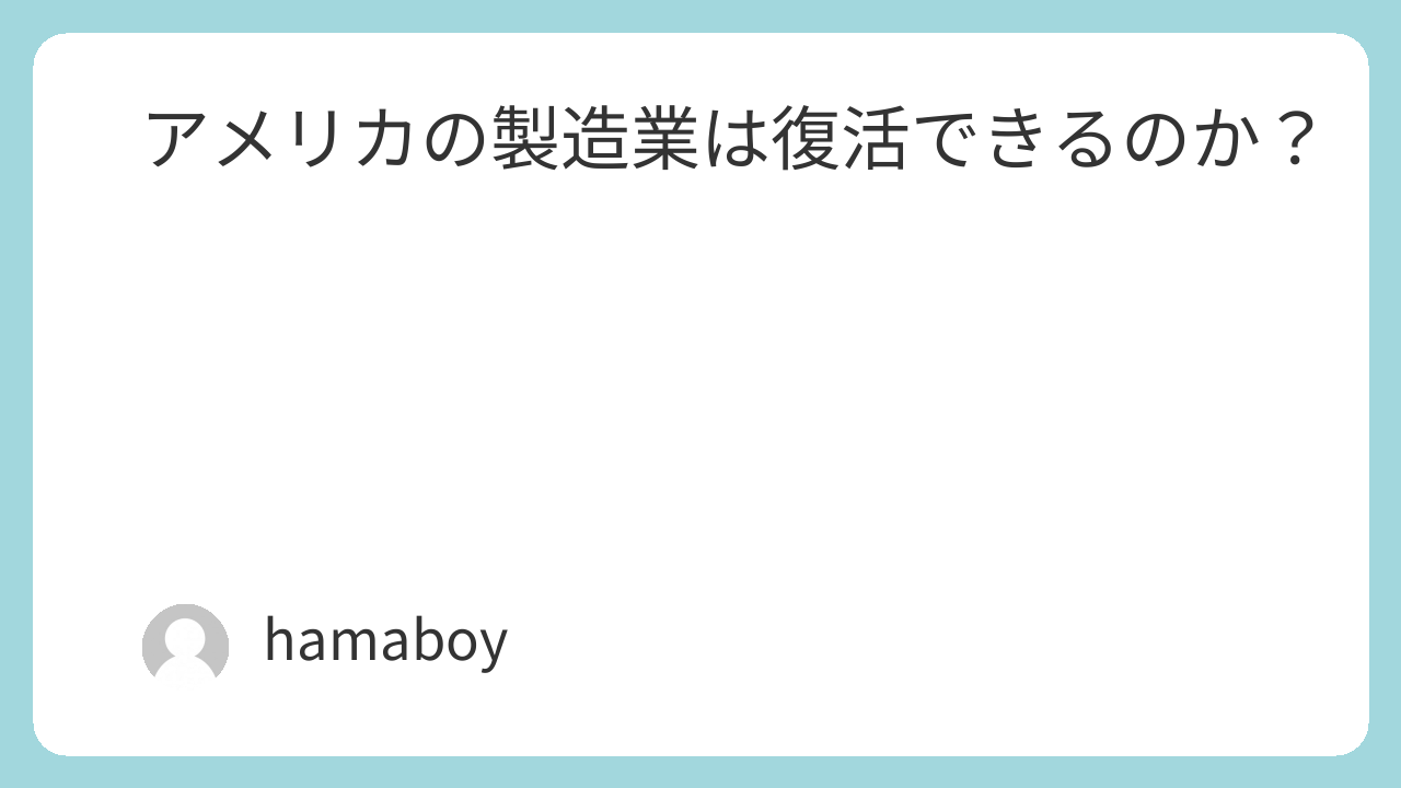 トランプ大統領はアメリカの製造業を復活させようと目論んでいらっしゃるようですが、巷では既に技術者が少なくなっているので簡単には無理だろうと噂されています。おそらくトランプ大統領もご存じで、その辺りの手を打ってこられるだろうと想像してます。但し、それだけでも世界に冠たる「最終商品」を作ることは、長年メーカーで勤務してきた私の視点では難しいと思います。不足しているのは「メーカーの心」です。詳しくは書きませんが、図面に表現されない問題・課題をどう解決して製品に取りこまれないようにするのかということです。