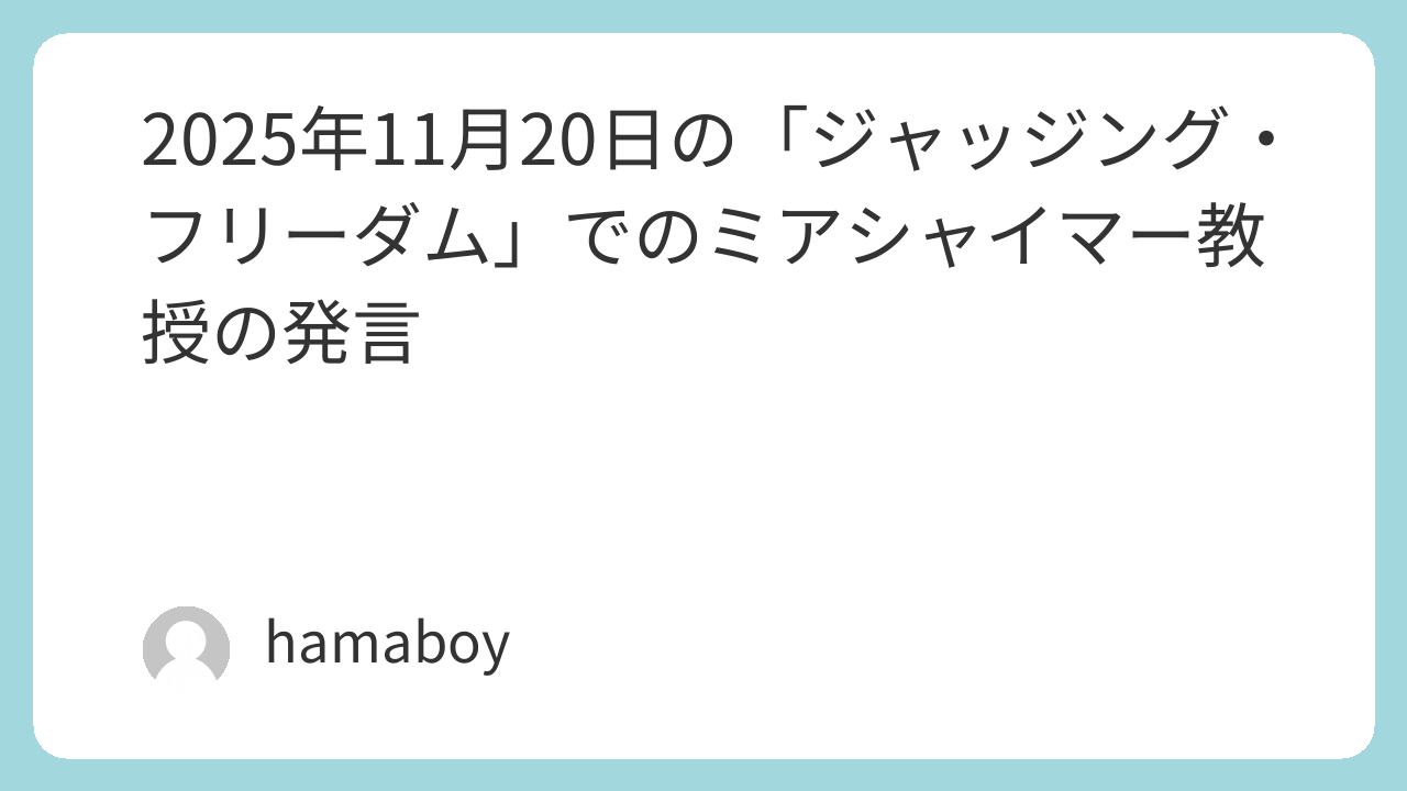 2025年7月20日(注:11月20日の間違い)のナポリターノ判事主宰の「ジャッジング・フリーダム」でのミアシャイマー教授の発言。複数のテーマがありますが、特筆すべきは「アメリカがイラン核施設を攻撃したのは、さもなければイスラエルは核兵器(保有を公言していない)を使うと脅したから」との元CIA職員の告発に、ミアシャイマー教授が「さもありなん。これは本当の脅威だ」と断言している件です。